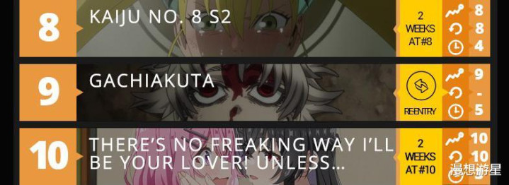 第十名,《我怎么可能成为你的恋人,不行不行!》;第九名,《咔嗒咔嗒》;第八名,《怪兽8号》第二季。