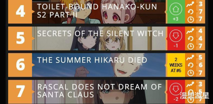 七至四名,《春猪头少年不会梦到圣诞服女郎》、《光死去的夏天》、《沉默魔女的秘密》、《地缚少年花子君》第二季。